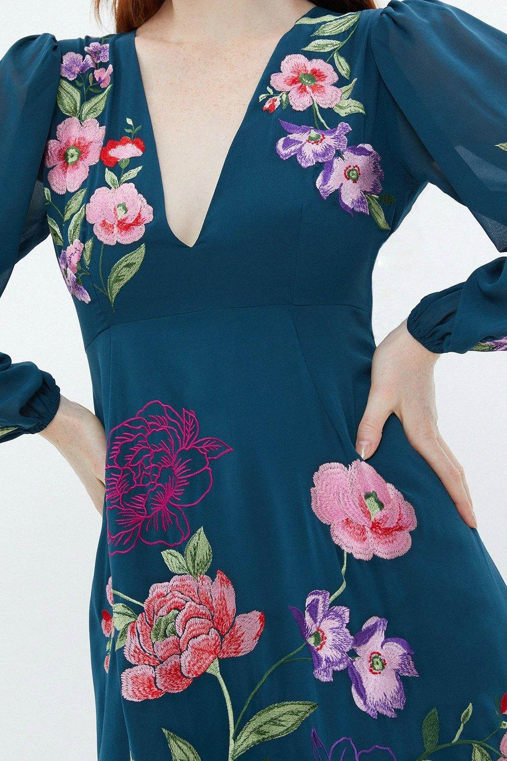 Channel a bohemian fantasy in this lace-trimmed mini dress. Cream tones contrast beautifully with its soft floral print, while black lace details add a dramatic edge. A tiered hemline and balloon sleeves provides a rustic charm, juxtaposed by the sultry addition of a plunge neckline.