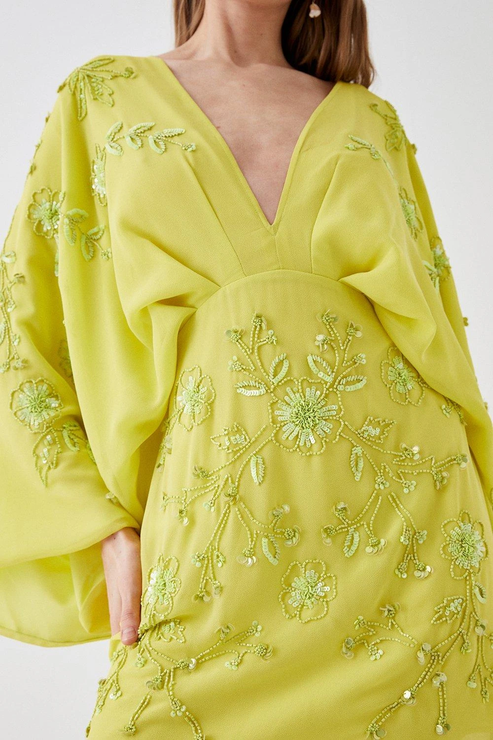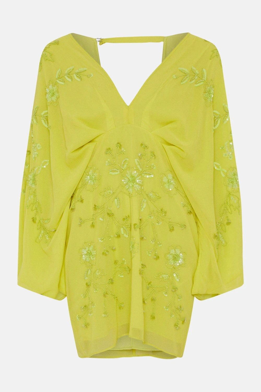 Style: All Over Beaded V Neck Kimono Mini Dress.
