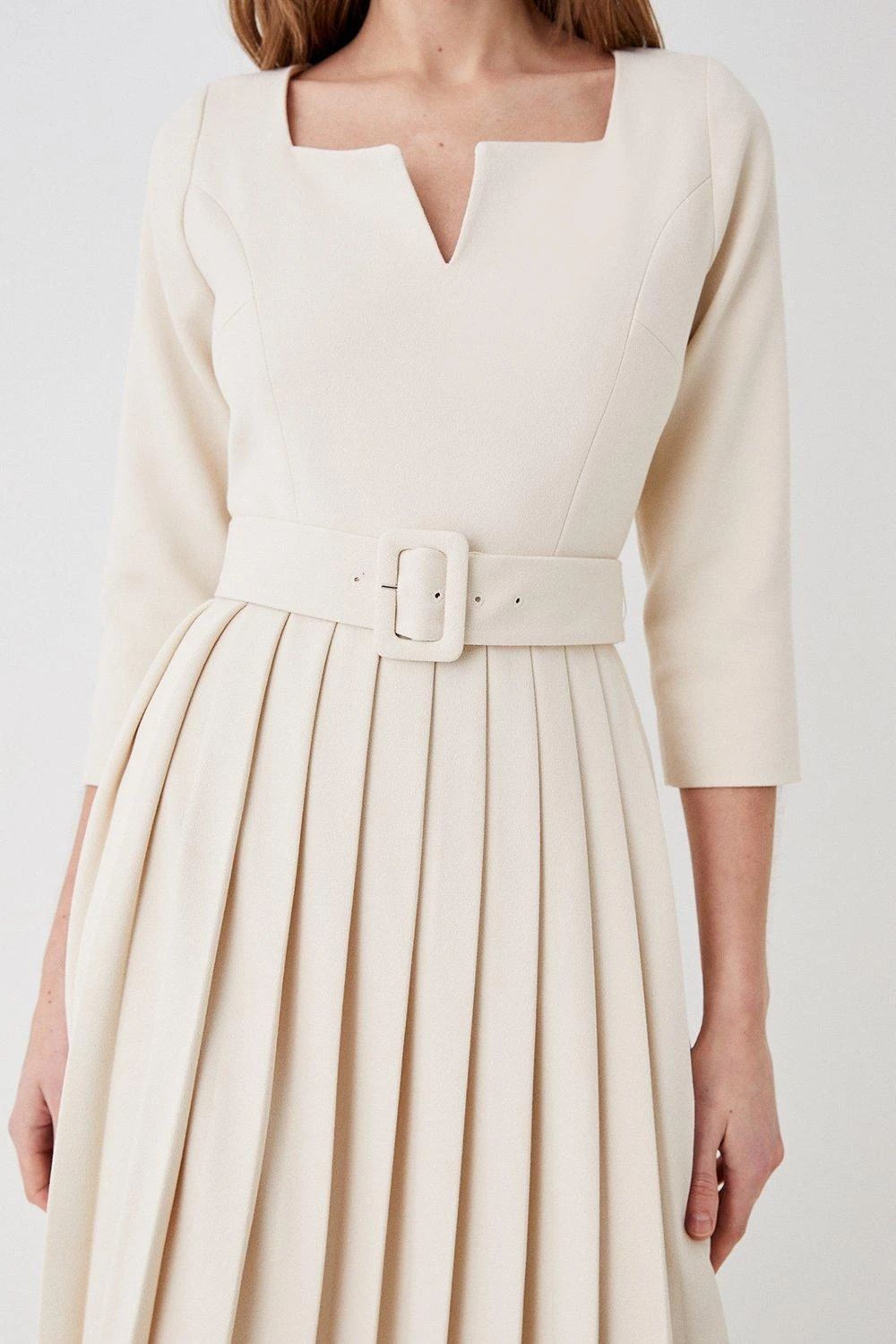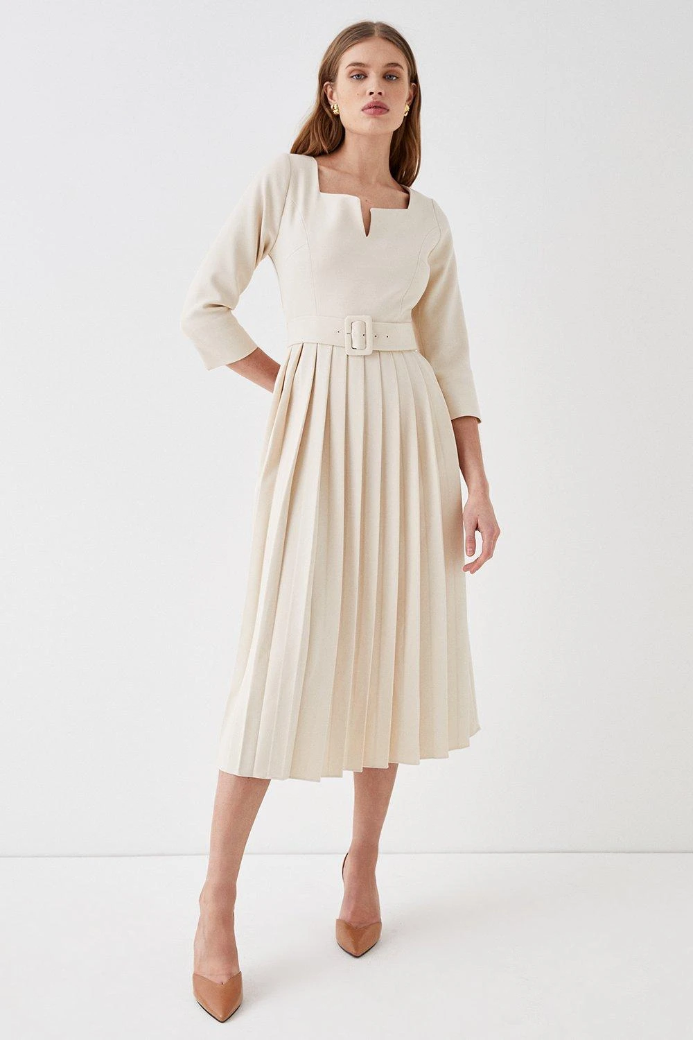 Style: Belted Notch Neck Pleat Midi Dress.
