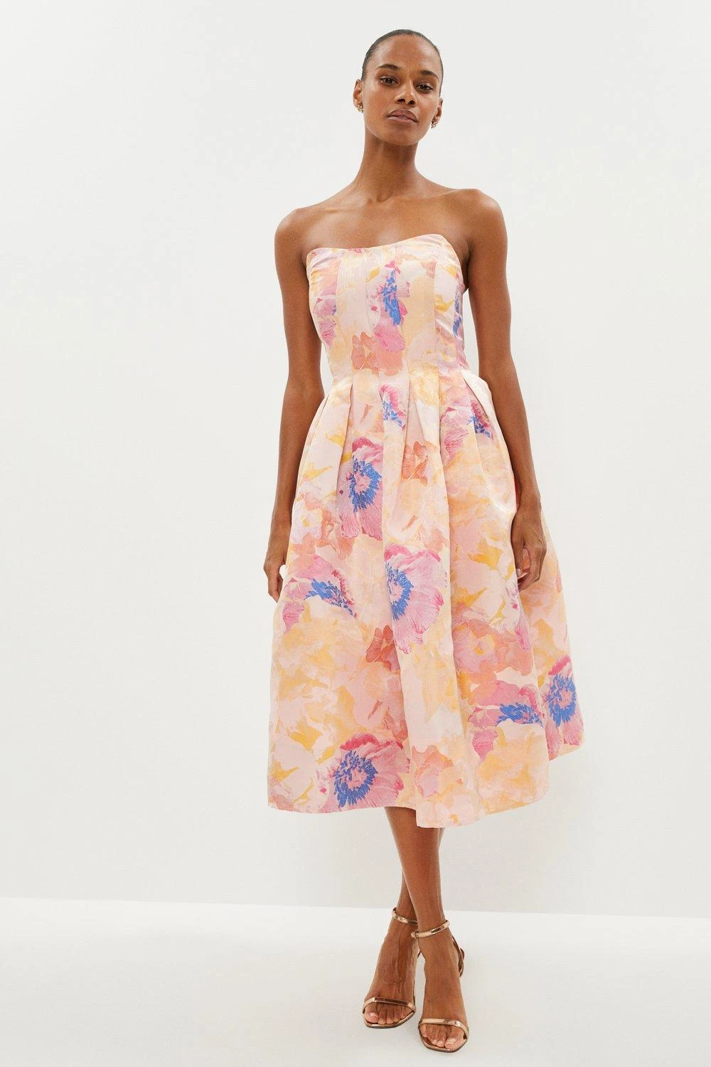 Richly detailed with pastel-pretty blooms, this prom-style midi dress makes an eye-catching choice for your next special occasion. The bust-sculpting bodice adds a streamlined finish to the top, enhancing a full skirt complete with sharply pressed creases for that inimitable vintage-inspired look.