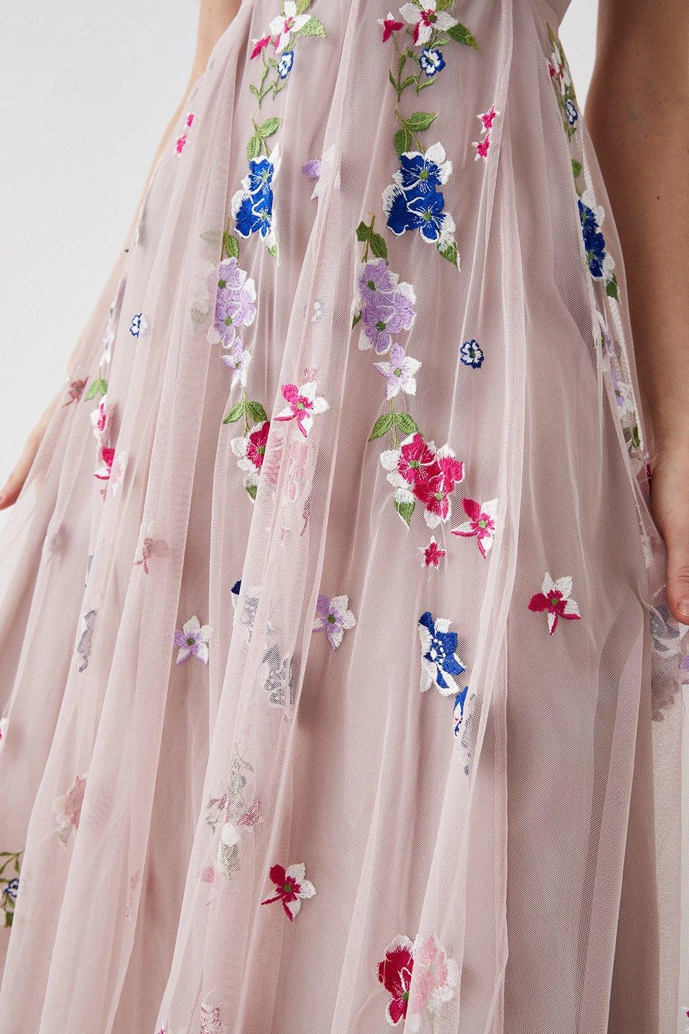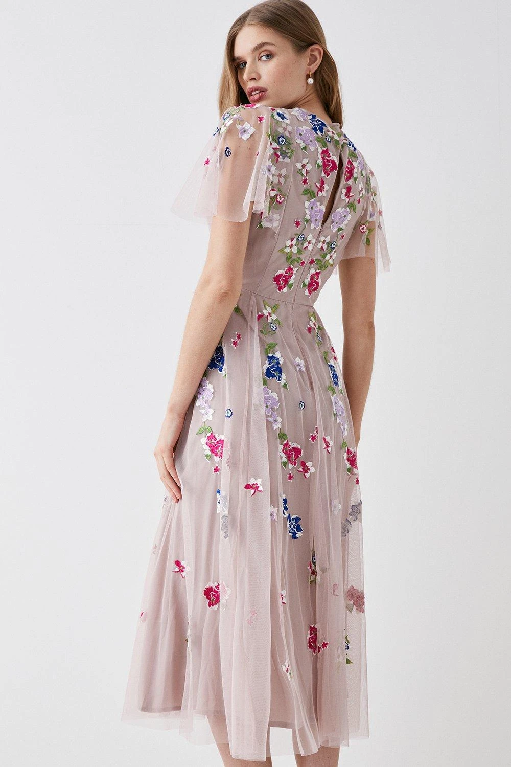 Style: Cape Sleeve Floral Embroidered Mesh Midi Dress.