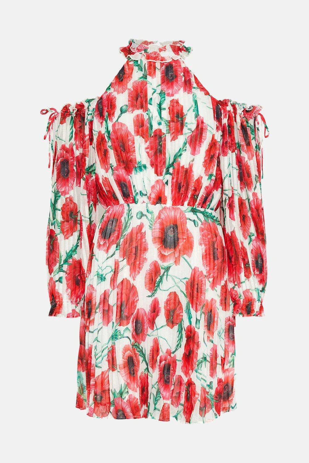 Give plain designs the cold shoulder this season in favour of this boldly printed design. Abloom with vibrant poppies and sharply pressed pleats, this alluring dress speaks to your love of pattern and print. It features unique shoulder cut-outs to show a glimpse of polished skin, accenting a frilly neckline and voluminous, puffed sleeves.