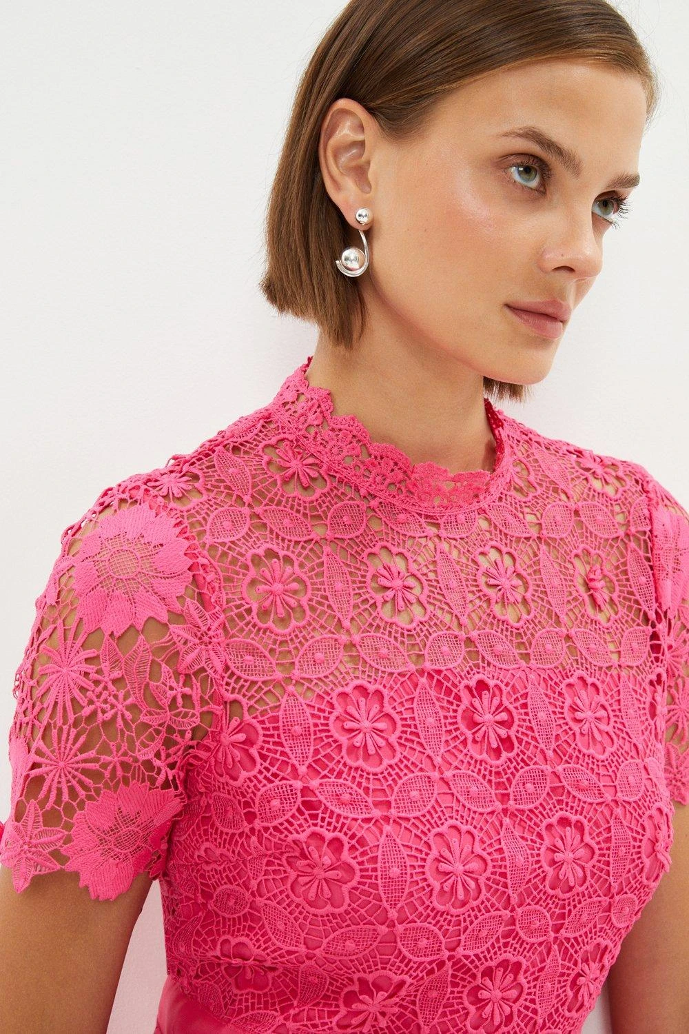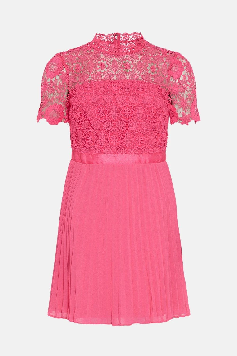 Look pretty in pink in this exceptionally elegant mini dress. It shows off a corded lace bodice that nods to artisanal craftsmanship along with a sharply pleated skirt cut to elongate the legs. Raw-edged lace trims enhance the silhouette, calling out for the addition of pearly accessories or a streamlined silver clutch.