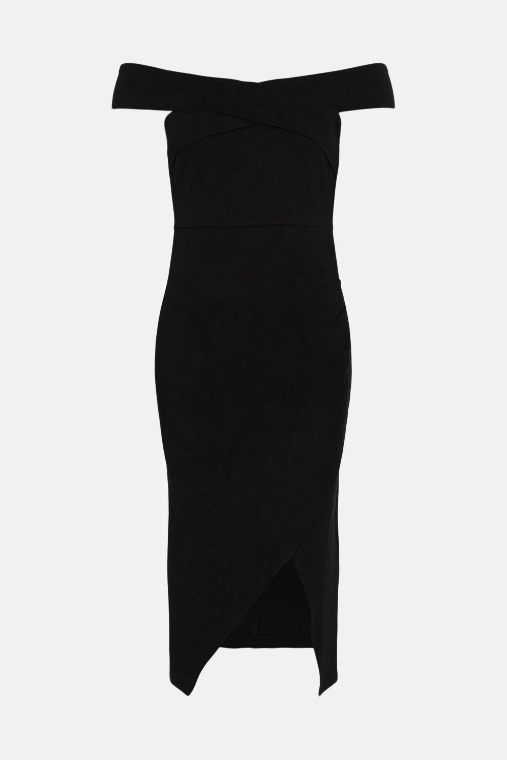 Designed to sculpt the form to streamlined perfection, this bandage-style pencil dress exudes easy glamour. The bodice features a wrap-over Bardot neckline to exposed polished shoulders, whilst the skirt comes complete with a seductive split to show a hint of skin as you stride. Zipped at the back, it slips on with elegant ease.