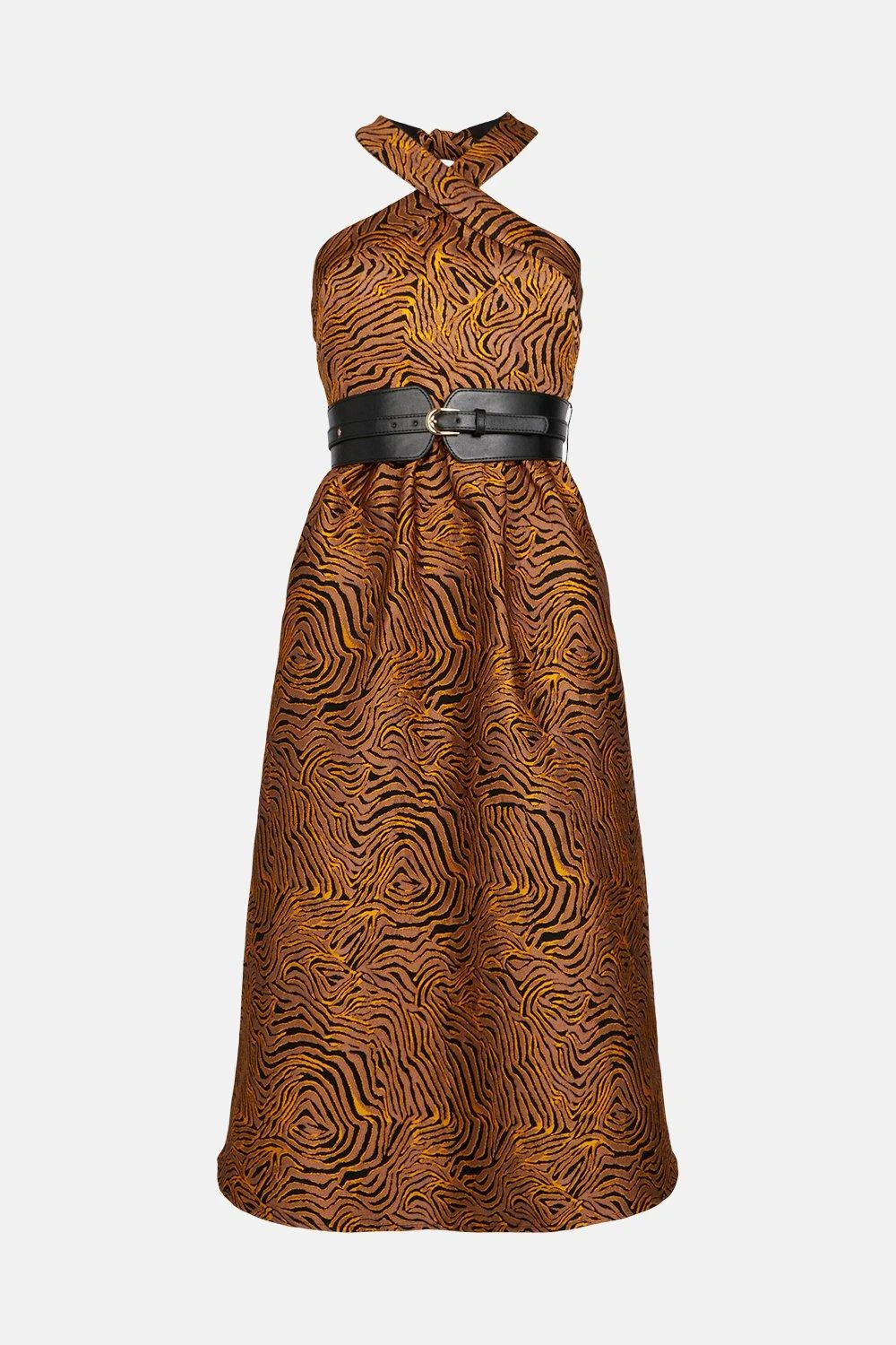 Coast Cross Front Belted Animal Print Jacquard Midi Dress