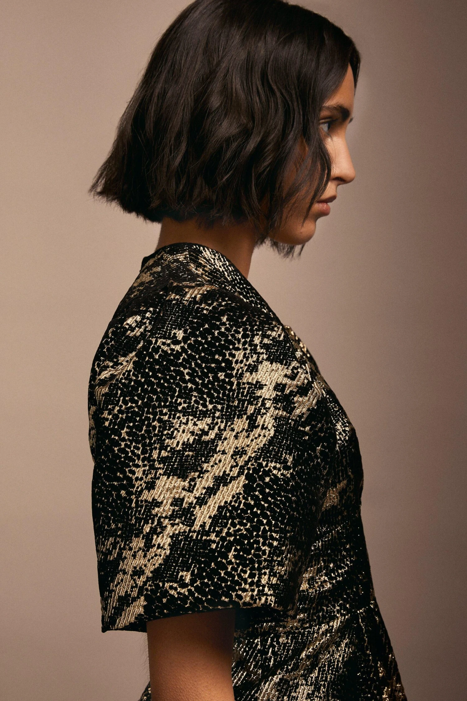 Main: 86% Polyester, 14% Metallised Fibre. Lining: 100% Polyester. Dry Clean Only. Length 92cm.