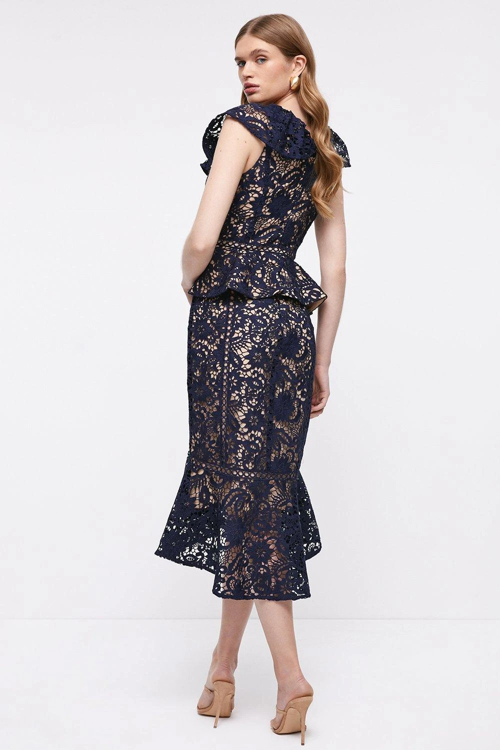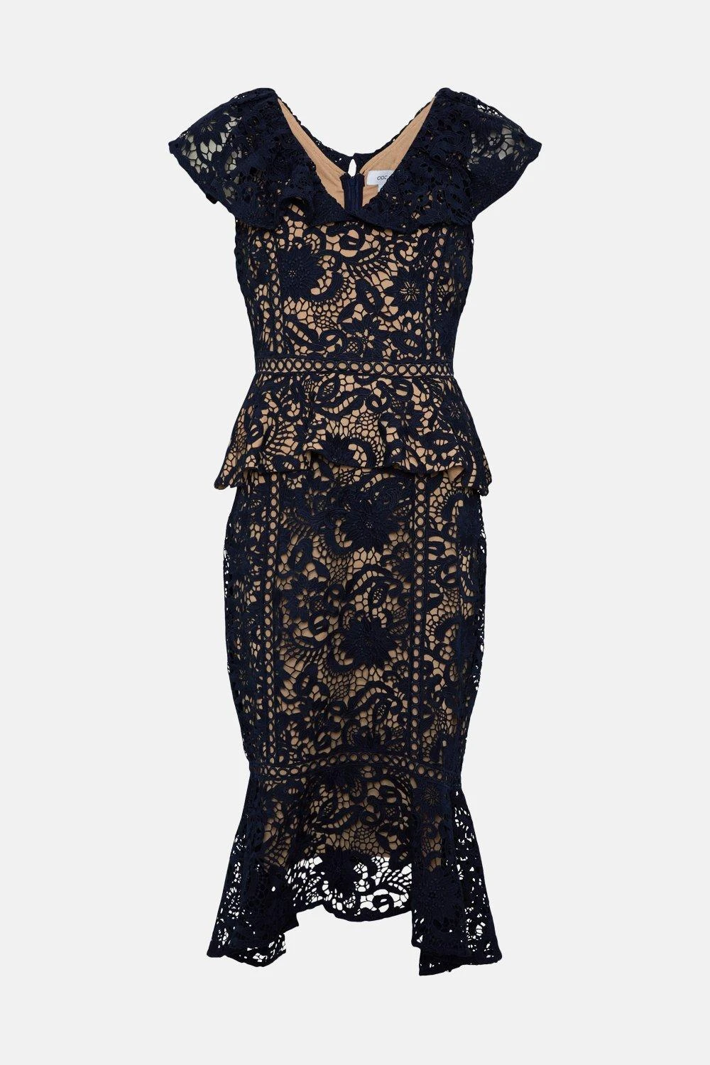 Style: Lace Pencil Dress With Dip Hem & Peplum.