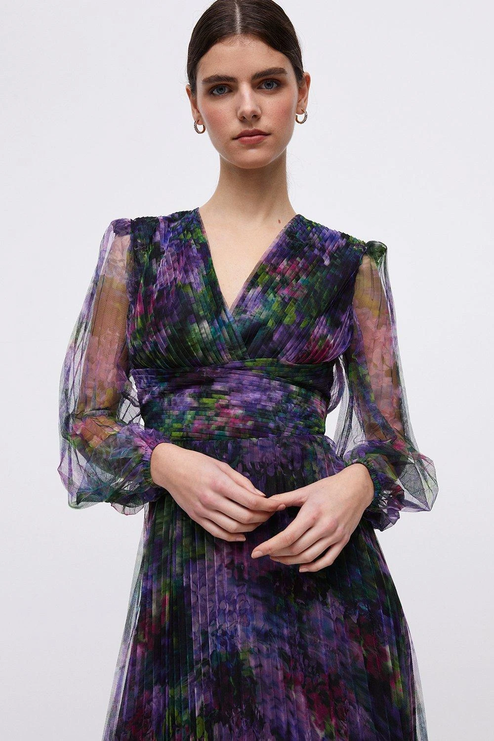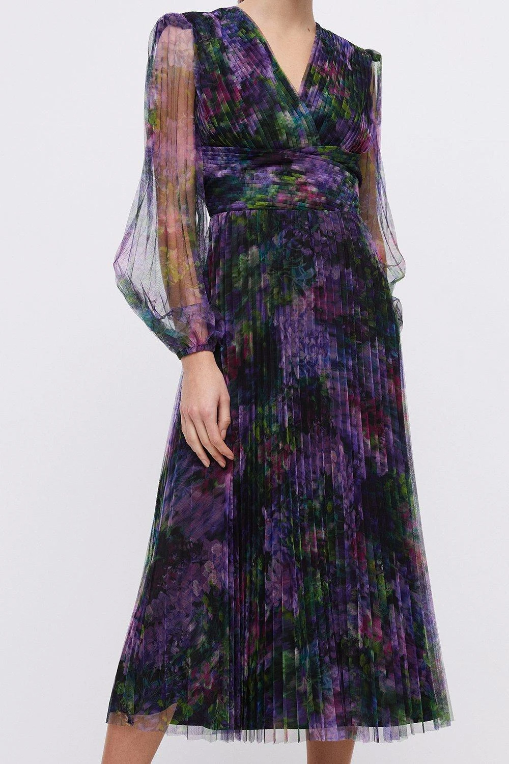 Style: Long Sleeve Waist Detail Pleated Mesh Midi Dress.
