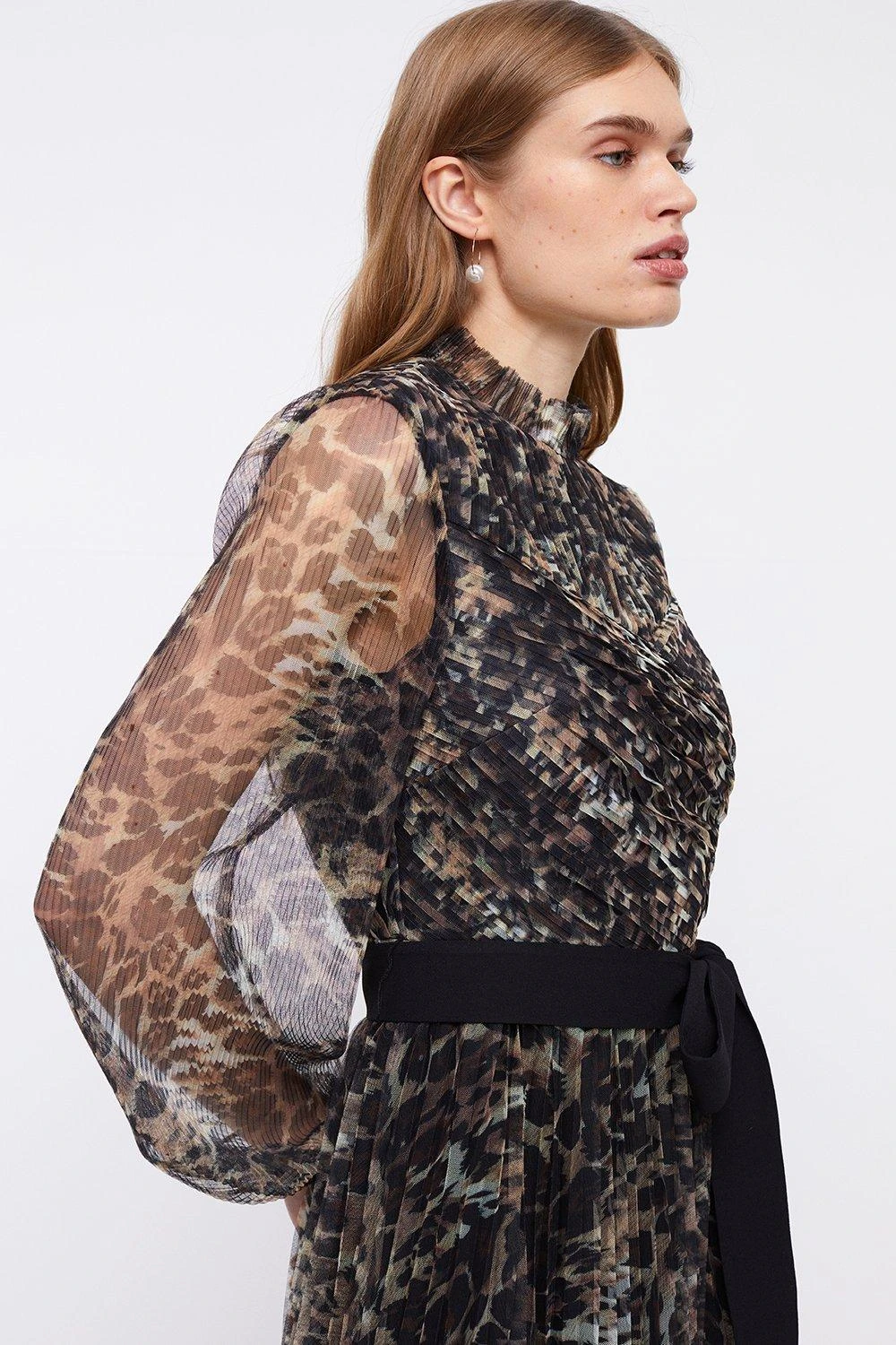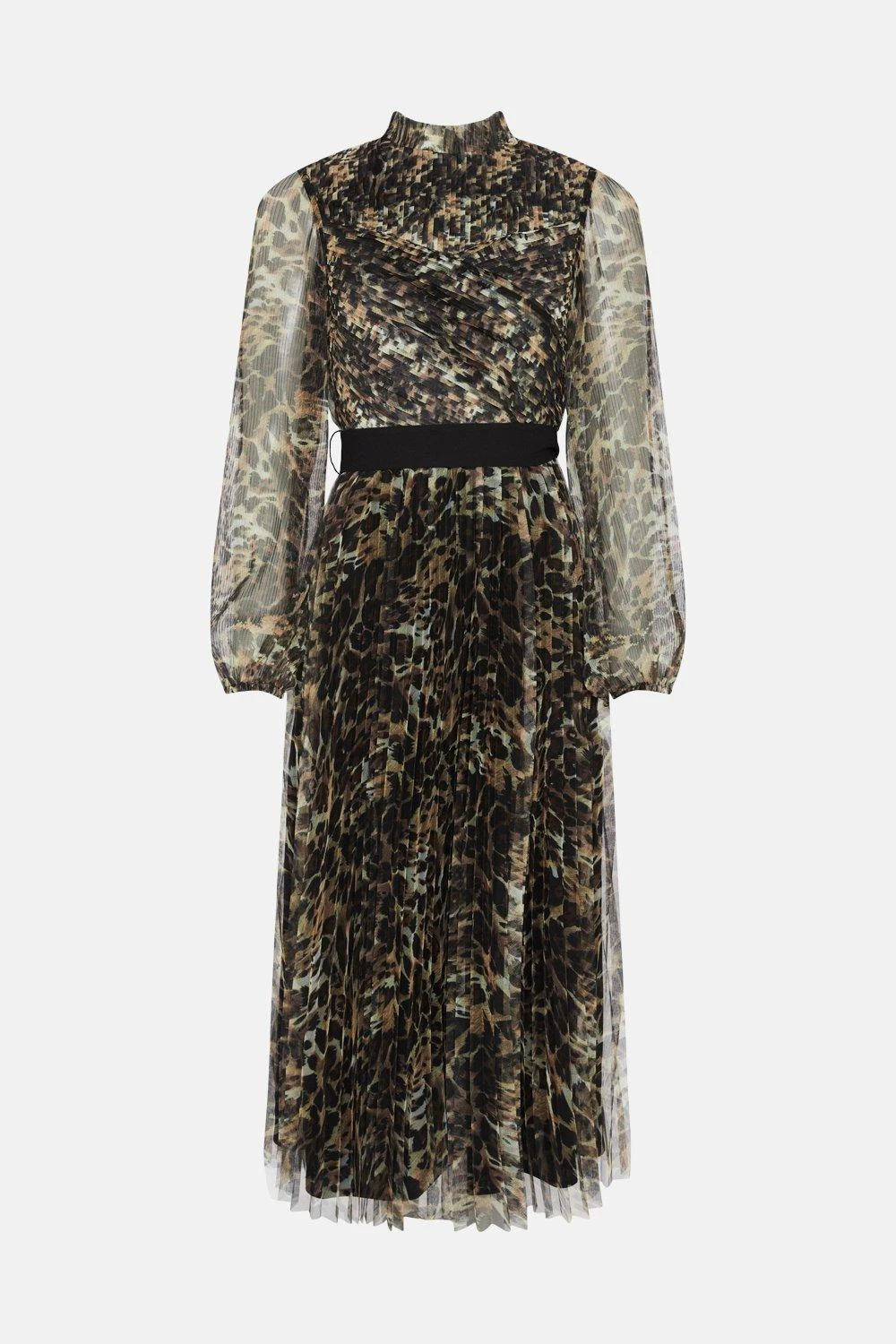 Style: Longsleeve High Neck Pleated Mesh Midi Dress.