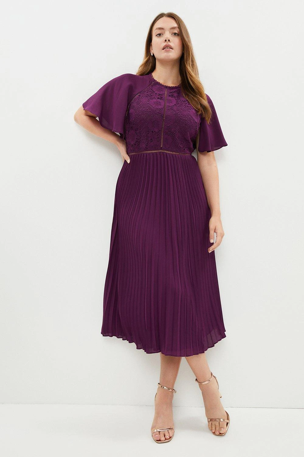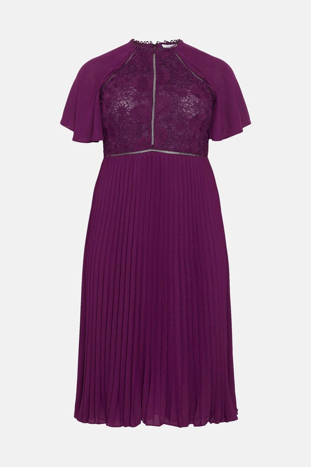 Fitted with fluttering cape-like sleeves, this gauzy midi dress lends quiet glamour to summer weddings. A luxe lace bodice offsets swishy pleats that drape to a demure below-knee length ? add metallic heels for a modern finish.