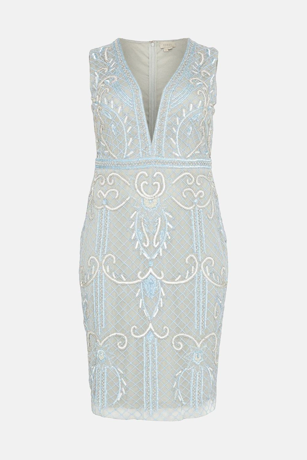 Thousands of light-catching beads add texture and intricacy to this arresting midi dress. Part of our premium collection, its impeccable finish and simple pencil silhouette make it a must-have option for special soirees.