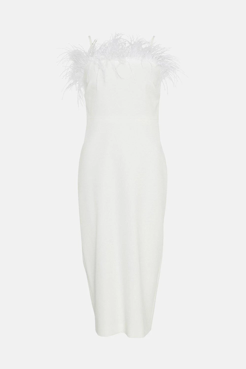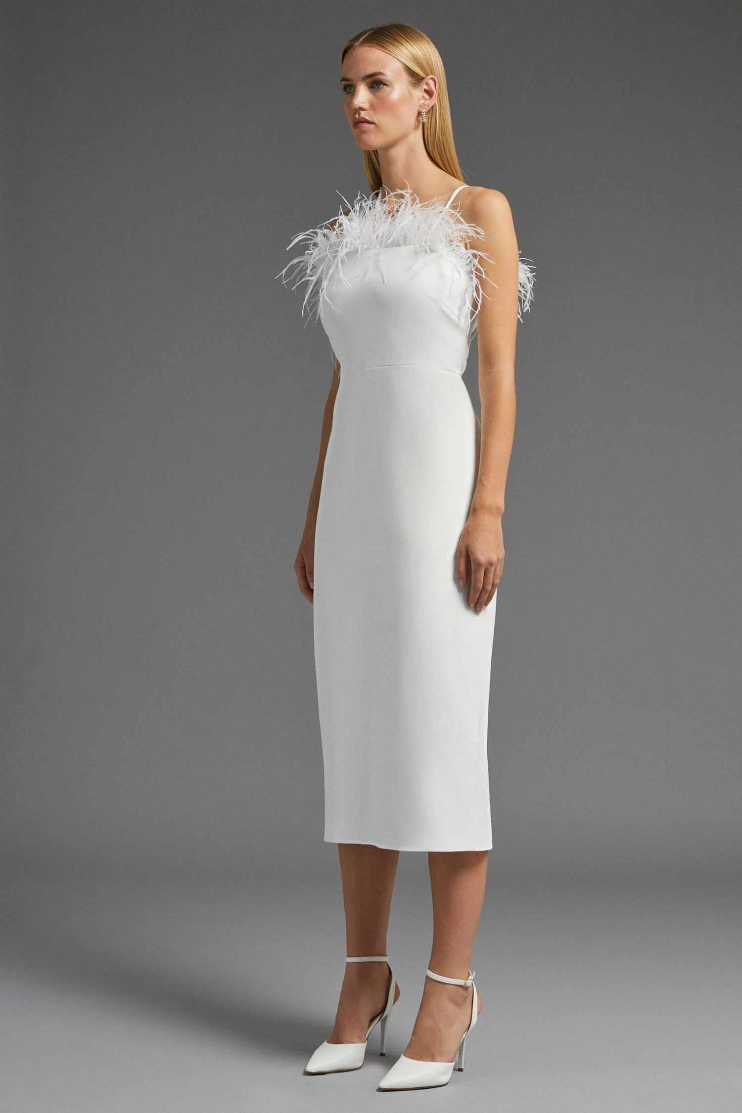 A sophisticated melange of feathers and fabric ensure this sleek pencil dress is one to watch for wedding season. Framing the decolletage with its flamboyant feathered trim, there’s no need for a necklace with this scene-stealing piece. Elevate the simple, form-fitting silhouette with strappy ivory heels for your walk down the aisle.