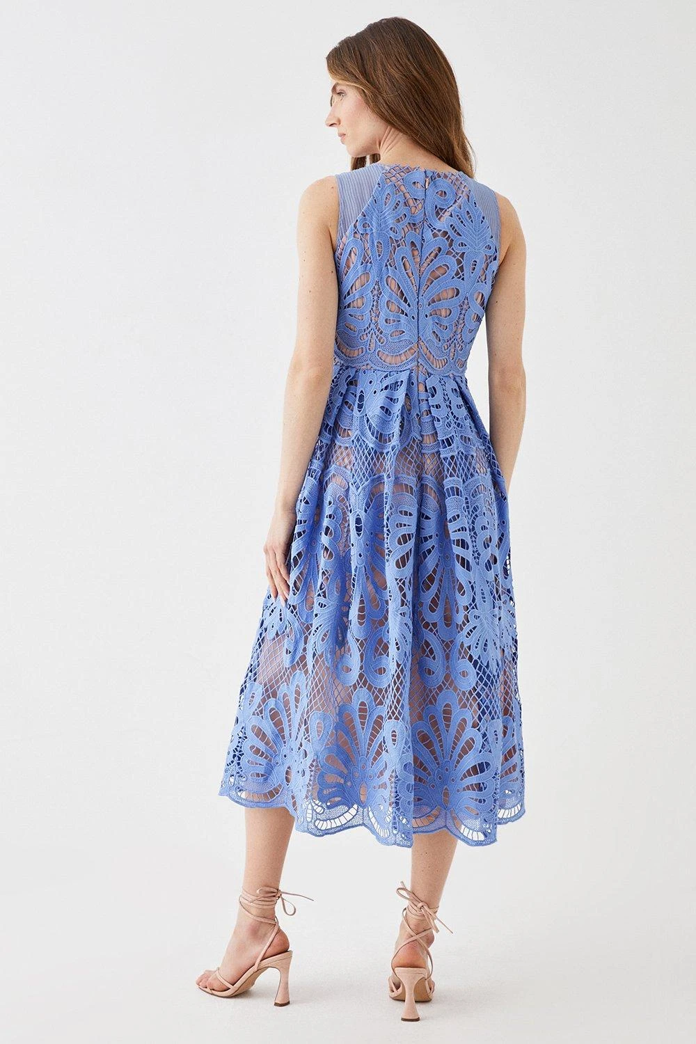 Style: Premium Sleeveless Lace Midi Dress With Contrast Lining.