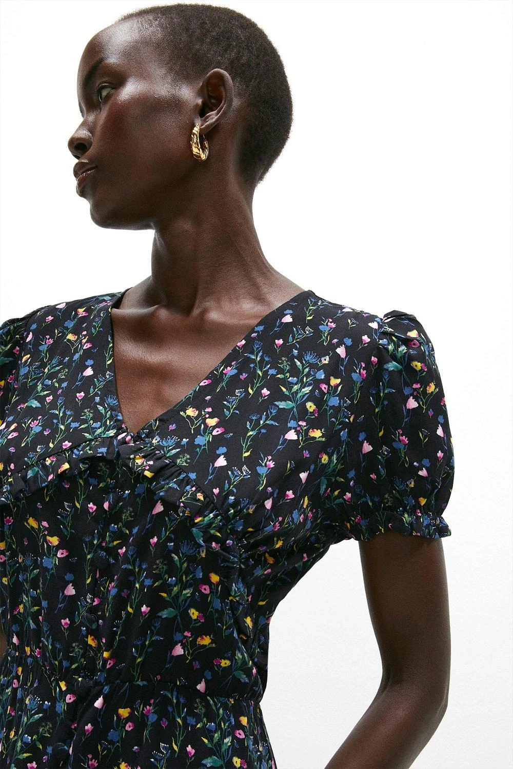 Pretty as a picture. This dobby button tea dress never fails to impress. It features capped sleeves, a frilly bustline and ruched waist. Add some layers, and you can wear it all-year-round too.