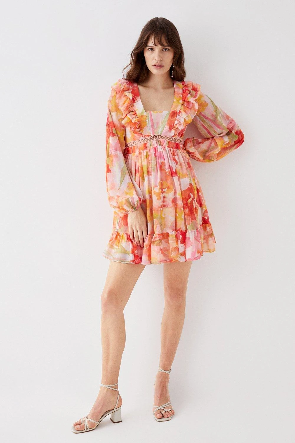 Style: Printed Tie Back Ruffle Detail Mini Dress.