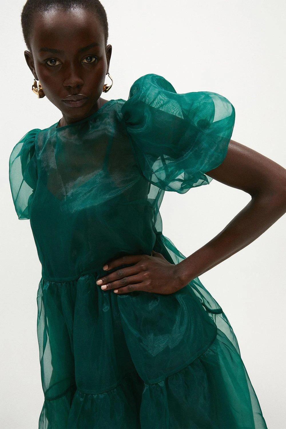 A vision of beauty. This dress is a special addition to any occasion wardrobe with its puff sleeves, delicate layers and plenty of volume.
