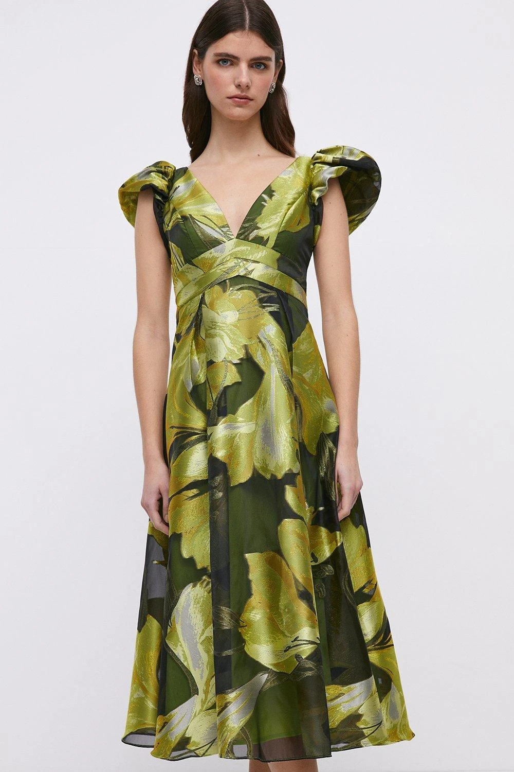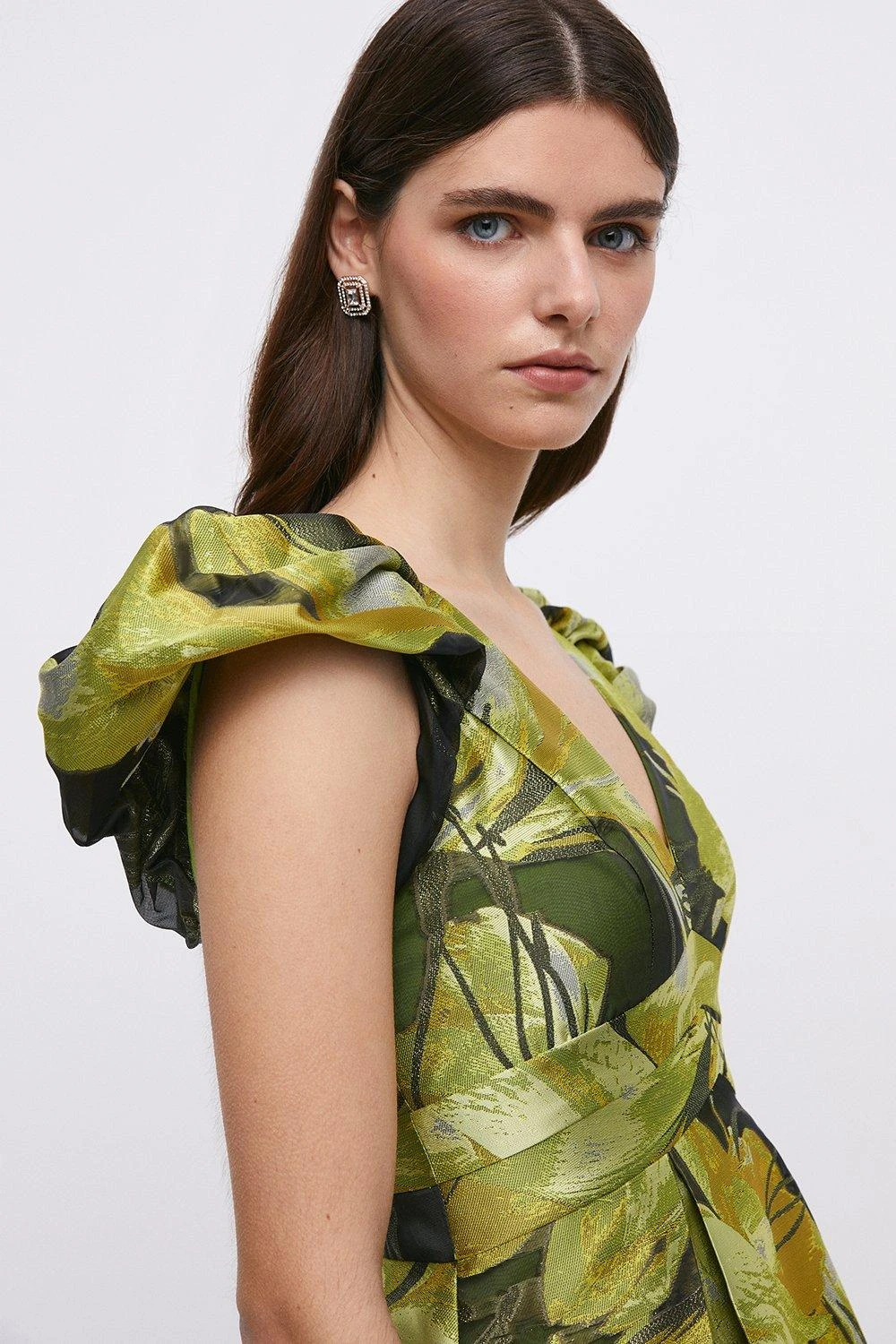 Style: V Neck Jacquard Dress With Frill Shoulder.